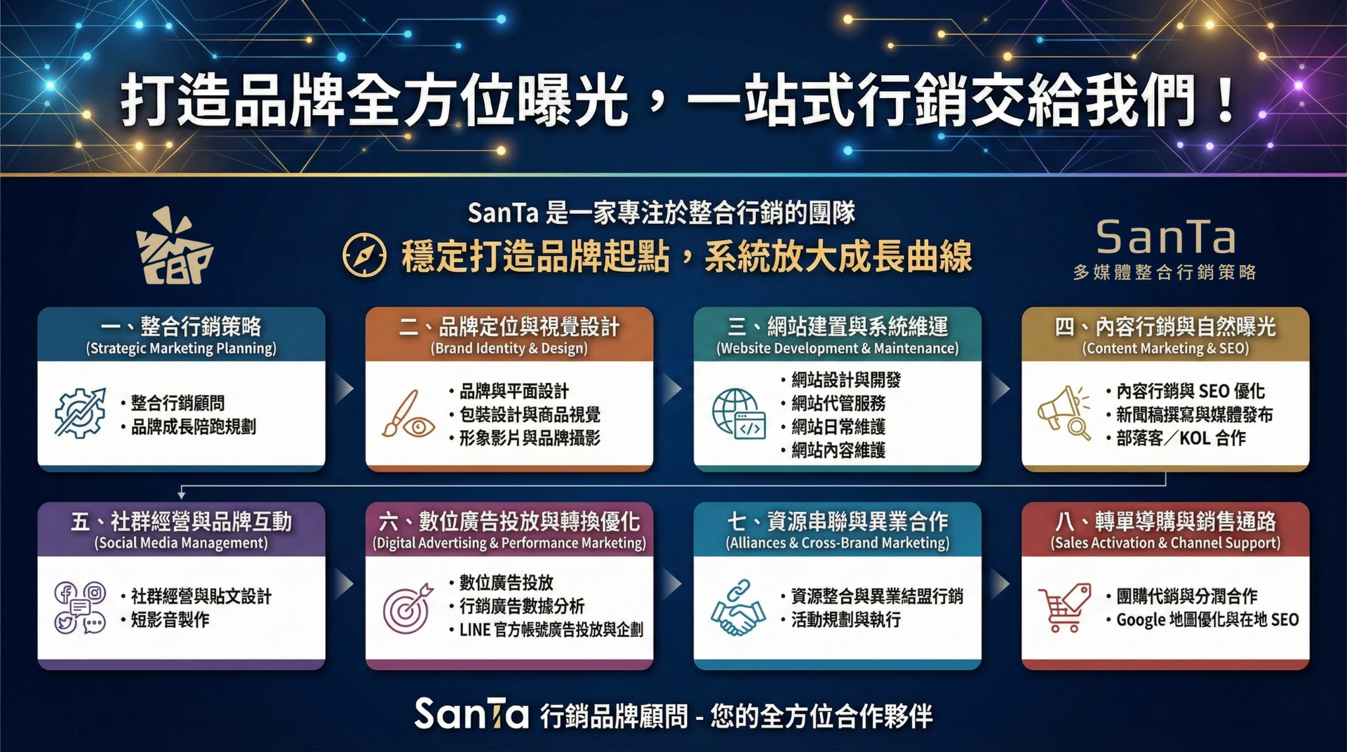 #品牌策略 #品牌設計 #網站設計 #內容行銷 #社群經營 #SEO優化 #廣告投放 #異業合作 #Google地圖優化 #行銷顧問 #整合行銷